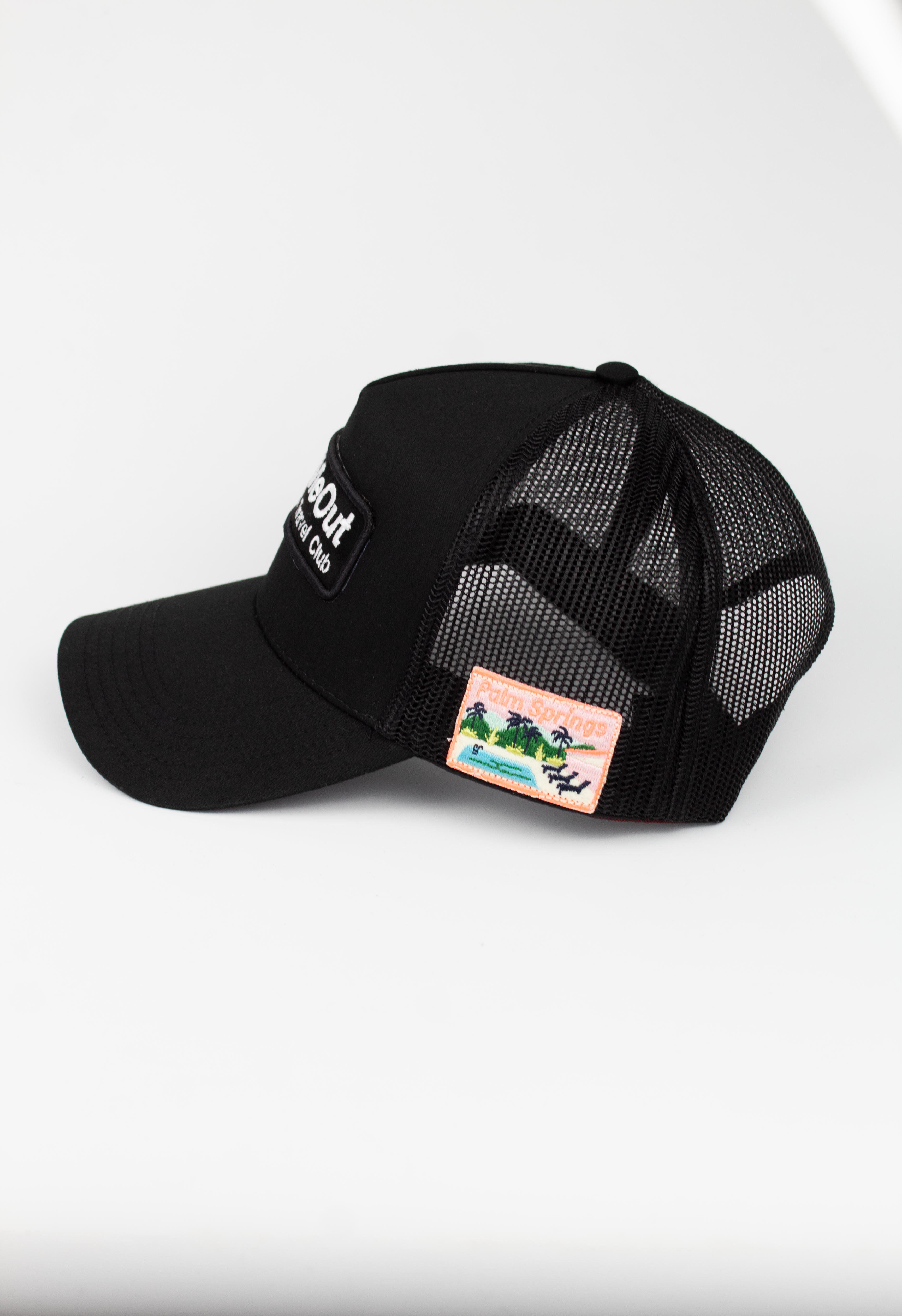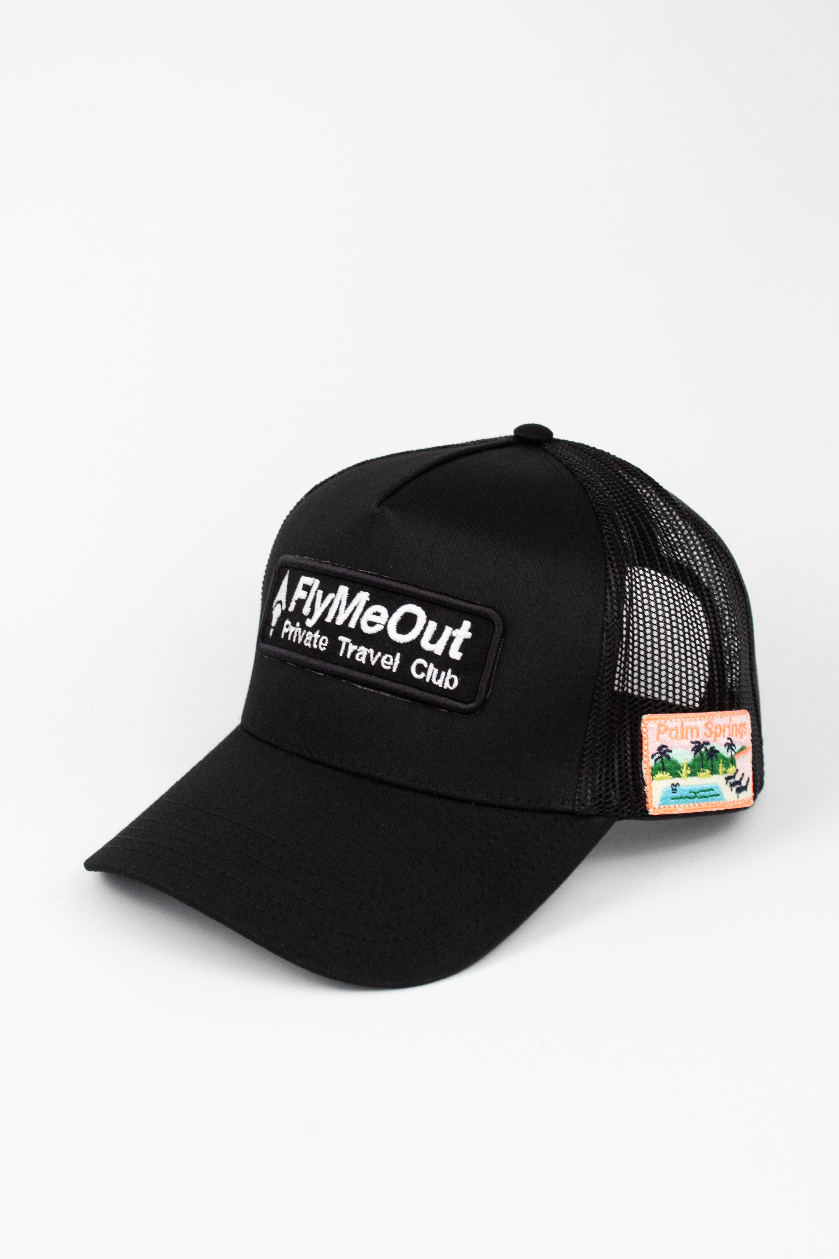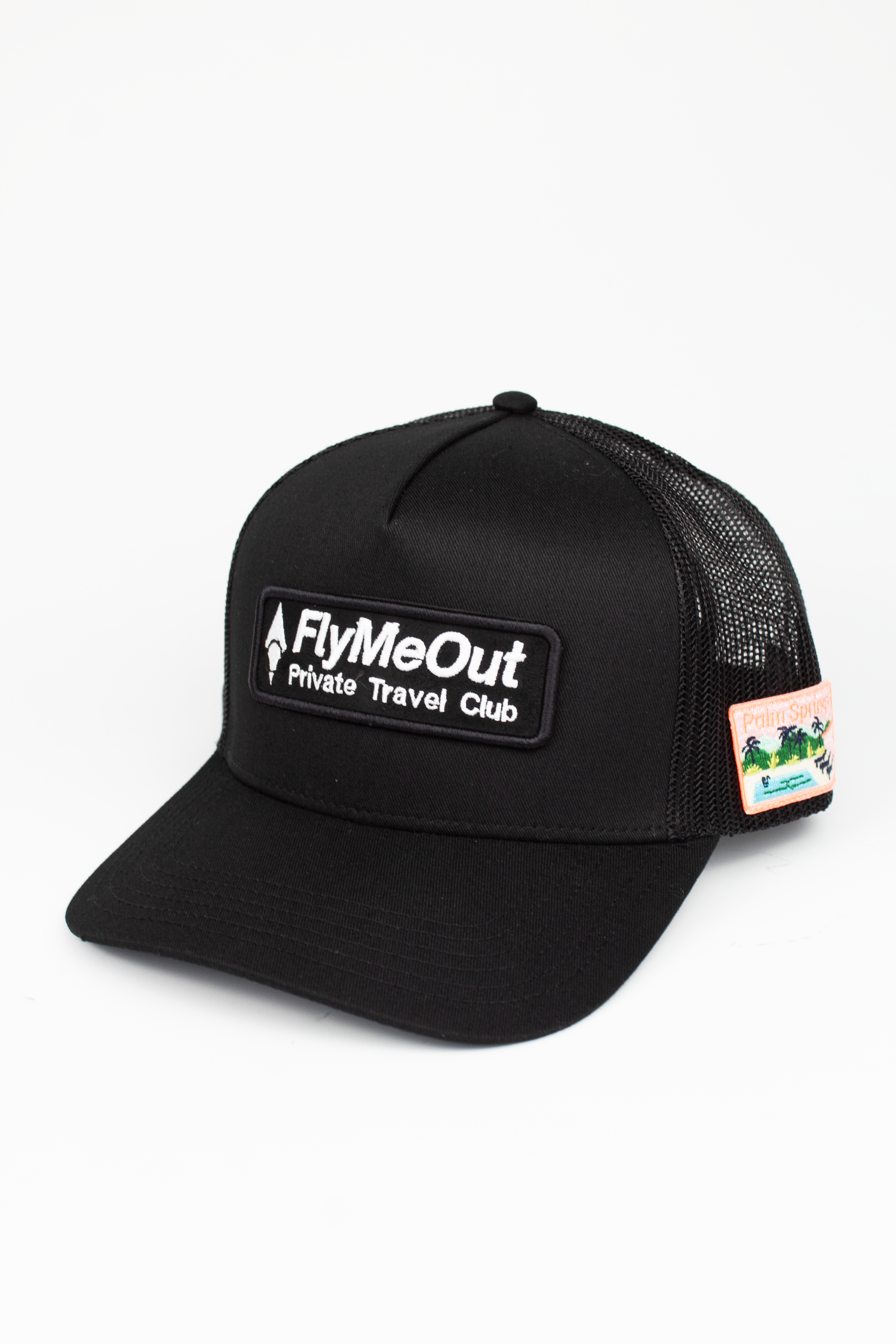 Collector’s trucker hat sporting a suede FlyMeOut logo front patch, Palm Springs side patch, mesh back, and adjustable snap.